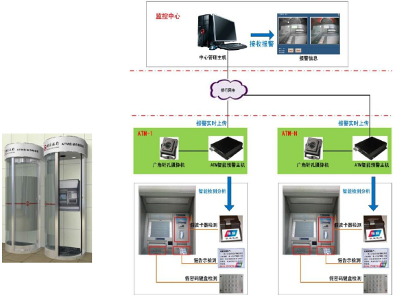 但是,隨著ATM機的廣泛應(yīng)用,針對ATM的犯罪活動也越來越多,因此,浩云科技研發(fā)了一套針對ATM機安全防范的智能防護艙系統(tǒng)。